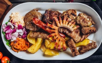 kom, pileći ražnjić 1 kom, rebrica 2 kom, uštipak 2 kom, pljeskavica 2 kom, zabatak 2 kom,